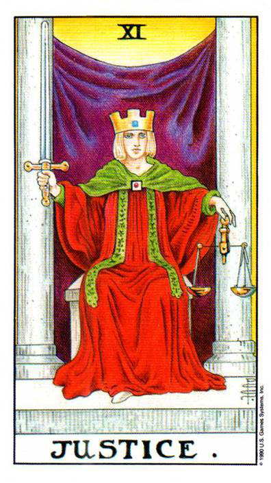 정의 타로 카드는 천칭자리와 숫자 11의 영향을 받습니다. 그녀는 붉은 옷을 입고 의자에 앉아 오른손에는 검을 들고 왼손에는 균형을 잡는 저울을 들고 있습니다. 왕관의 작은 정사각형은 논리적 사고를 표현하고 있습니다. 우리는 그녀가 걸치고 있는 가운으로도 알 수 있습니다. 사각형은 모두에게 적용되는 법, 원은 보호와 영원한 단결을 상징합니다. 양날을 가지고 있는 칼은 정의로 가는 길을 나타냅니다. 또한 승리를 의미하기도 합니다. 오른손에 든 칼은 공정성을 강화하기 위해 필요한 논리적이고 질서 있는 사고 체계를 나타냅니다. 그녀의 왼손의 균형, 즉 직관적인 손은 논리가 직관에 의해 조화롭게 균형을 이루어야 한다는 것을 보여줍니다. 그녀의 망토에서 나온 하얀 신발은 우리에게 행동이 가져올 정신적인 결과를 상기시켜줍니다. 그녀 뒤에 걸려 있는 보라색 천은 동정을 나타내며 회색 기둥은 물질 세계의 제약에 대해 이야기합니다.