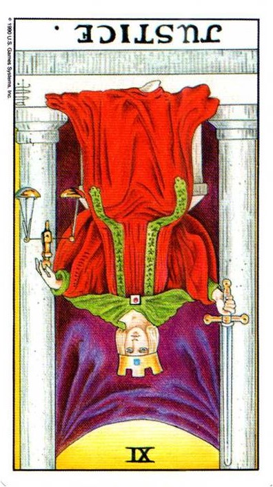 정의 타로 카드 역방향 의미 : 불공평, 투명성의 결여, 부정직, 결과가 지연되는