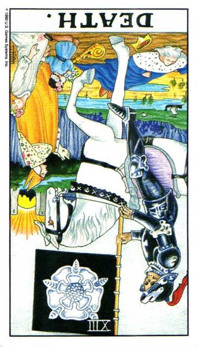 정방향의 카드처럼 죽음 카드의 역방향이 반드시 육체적 죽음으로 이어지는 것은 아니다. 만약 카드 리더가 카드를 이렇게 이해한다면, 그것은 그들이 정말로 무책임하다는 것을 의미합니다. 왜냐하면 우리는 자유로운 생명체이고 이것을 결정할 수 있는 강력한 힘이 없기 때문입니다. 정방향이든 역방향이든 이 카드는 단순히 변화와 변혁을 지시했을 뿐입니다.