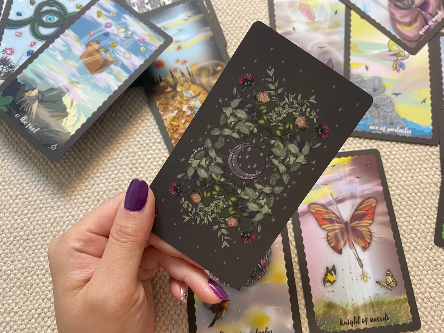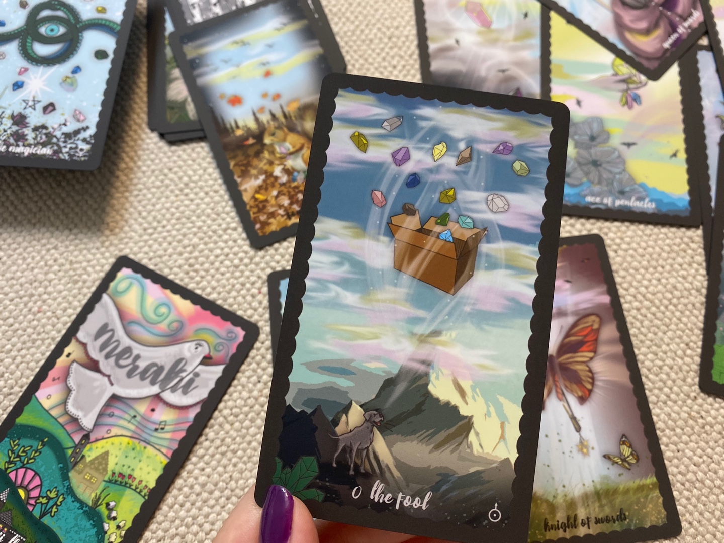 메라키 타로는 자연과 동물, 마법에 영감을 받아 일러스트를 제작한 덱이라고 합니다. 78장에 타로 카드와 하나의 메라키 추가 가트를 가지고 있고 5장의 정보 카드가 함께 들어있습니다. 그리고 카드들 역시 모두 매트한 소재의 느낌이네요.