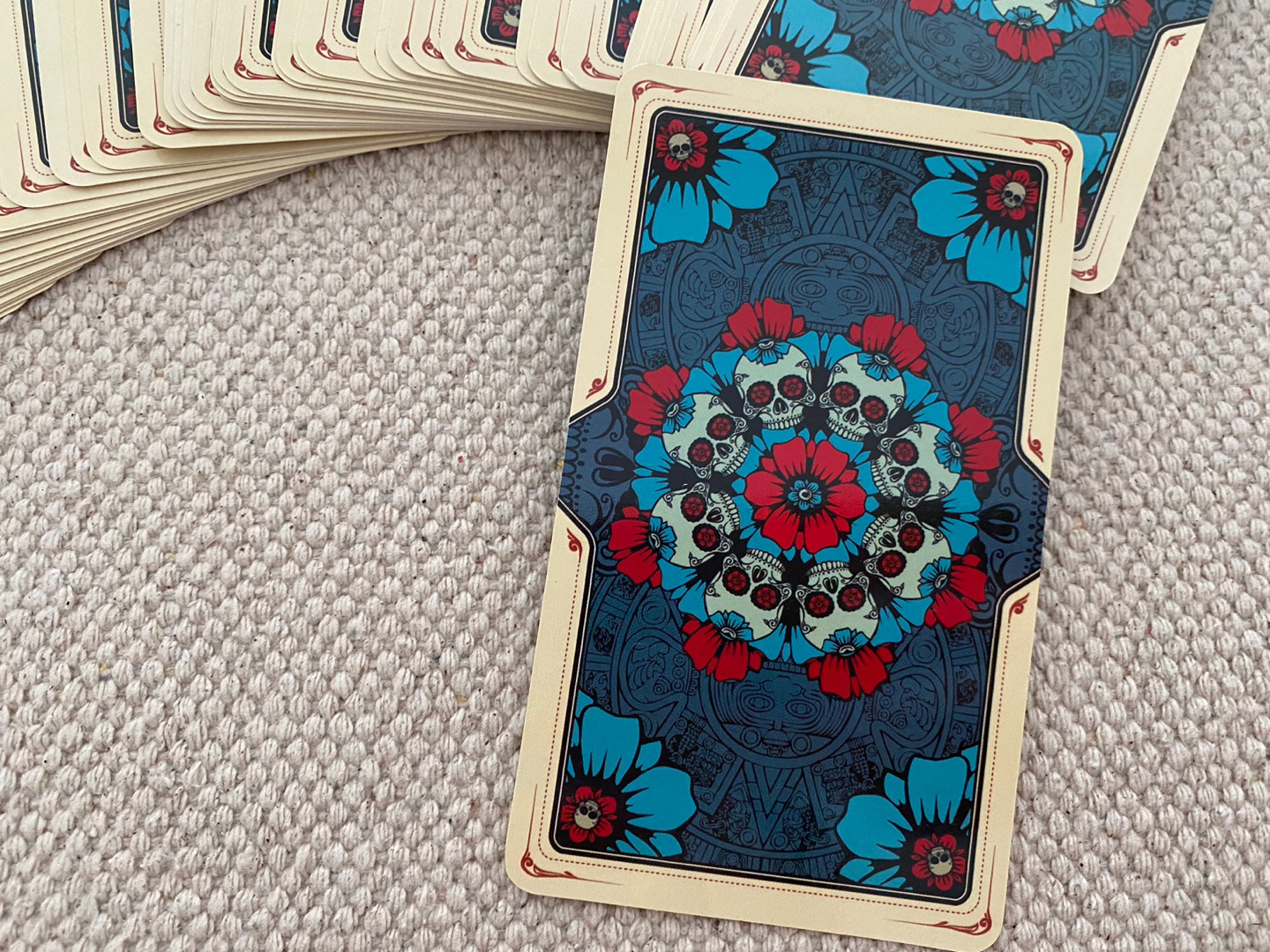 뒷면은 이렇게 해골 모양의 꽃으로 장신되어 있으며 전체적으로 톤이 다운된 컬러라서 더욱 타로 덱을 고급스럽게 만들어주죠.