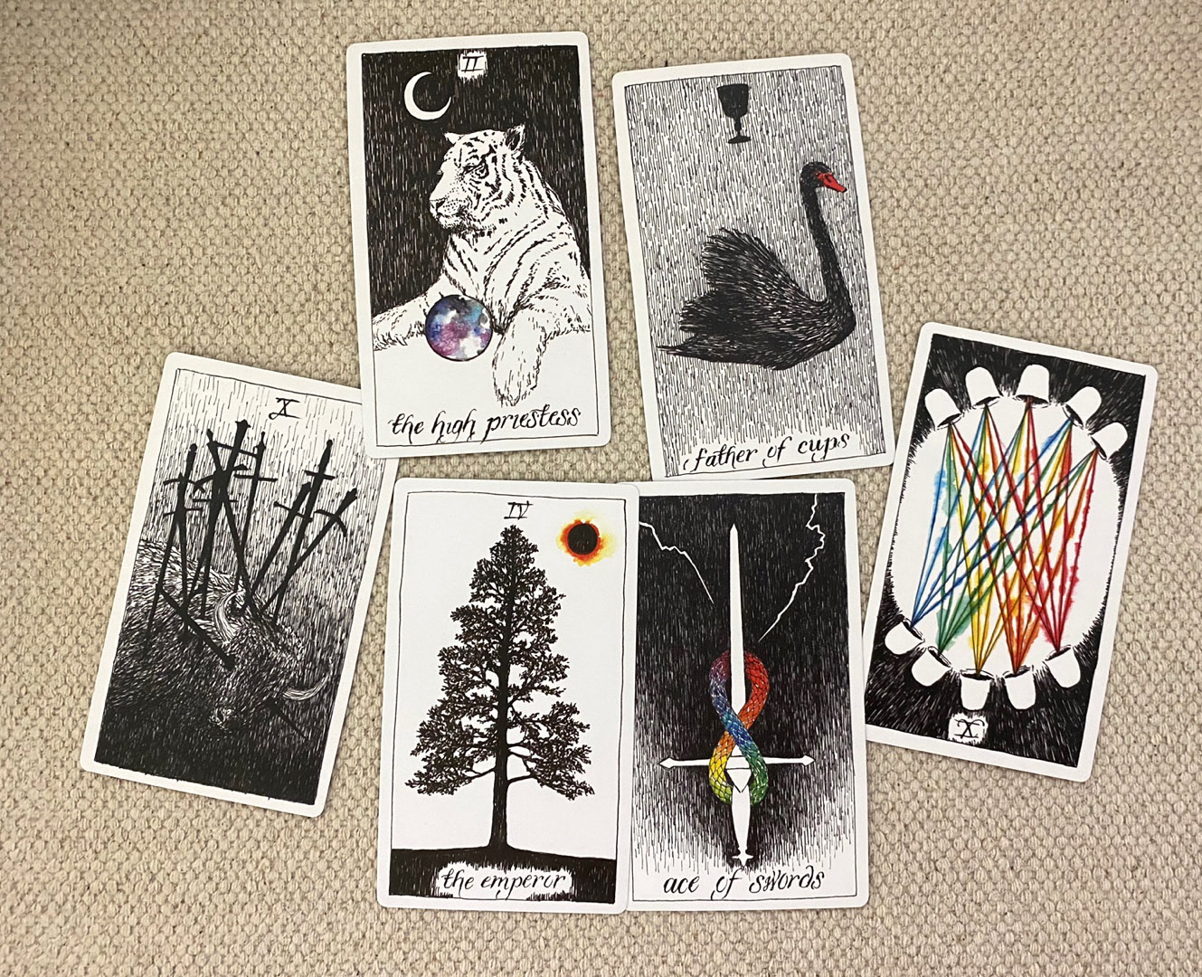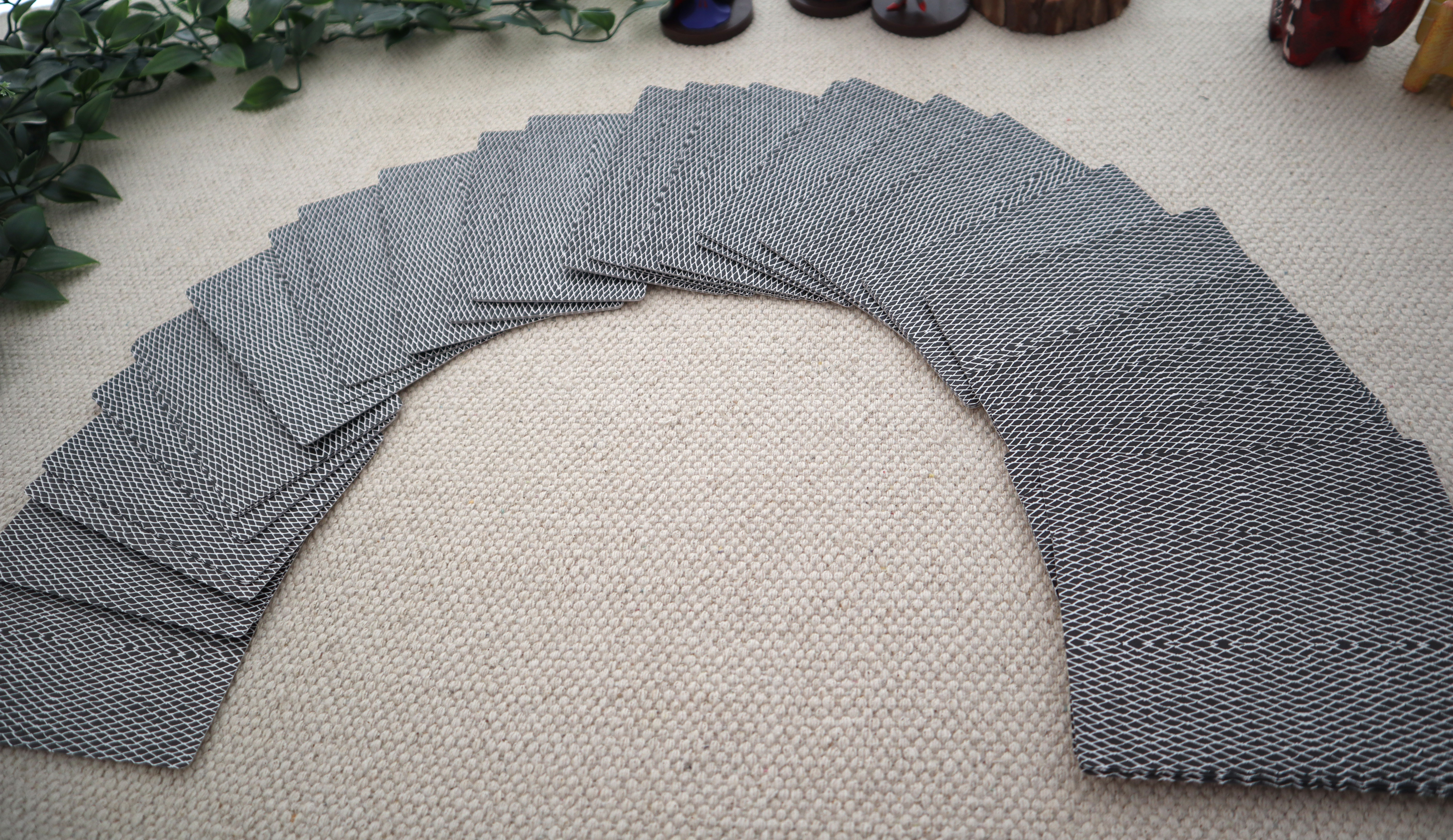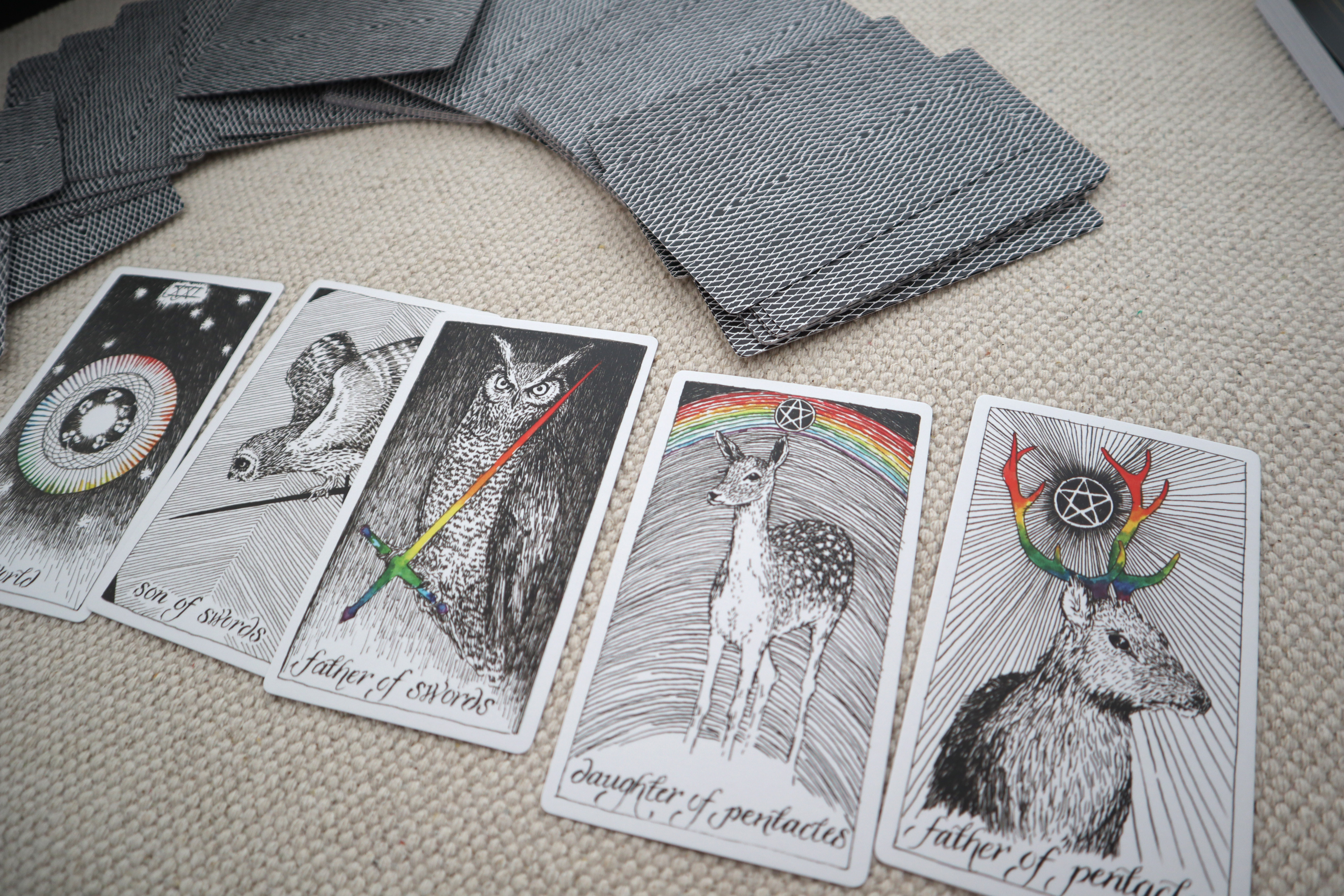 무광으로 되어있어서 상당히 매트한 느낌의 카드에요. 그래서 그런지 셔플 및 스프레드 등등 잘 펼쳐지지 않는 건 확실합니다. 아마도 여기에 파우더를 뿌려서 사용하시는 분들도 계시다고 들었는데 저는 자주 사용하는 카드가 아니라서 그냥 뒀더니 저렇게 펼쳐지지가 않아요 ㅠ