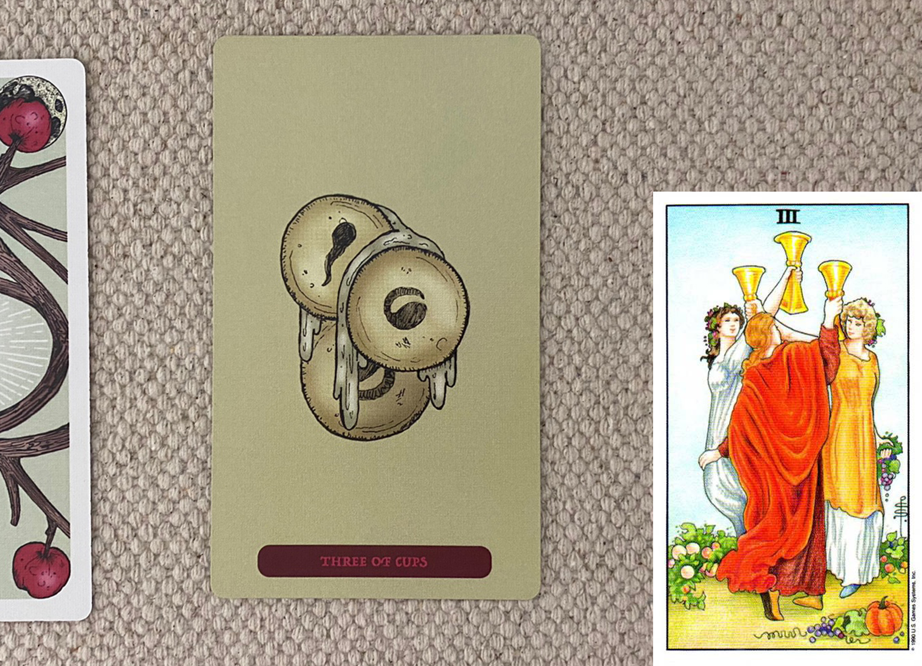 이 카드의 3개의 컵은 축하를 전하고 있는 카드입니다. 파티를 준비하는 모습입니다. 무엇을 원했든 간에 충분한 결론이 나는 날이며 이것은 완벽하고 떠들썩하게 축배를 드는 승리가 될 것입니다. 또한 즐거운 모임, 결혼이나 출산과 같은 모든 사람들이 축하할 만한 행복한 사건을 의미합니다. 즐거움과 쾌락을 즐기는 날이 될 것입니다. 하지만 이 카드의 생산성은 없습니다. 즐거운 시간을 보내 축하할 일이 있지만 미래의 비전을 제시하는 카드는 아니기 때문에 미래를 기대할 수는 없습니다. 그러니 그냥 오늘을 즐기시길 바랍니다. 내일은 다시 내일의 태양이 뜨니까요.
