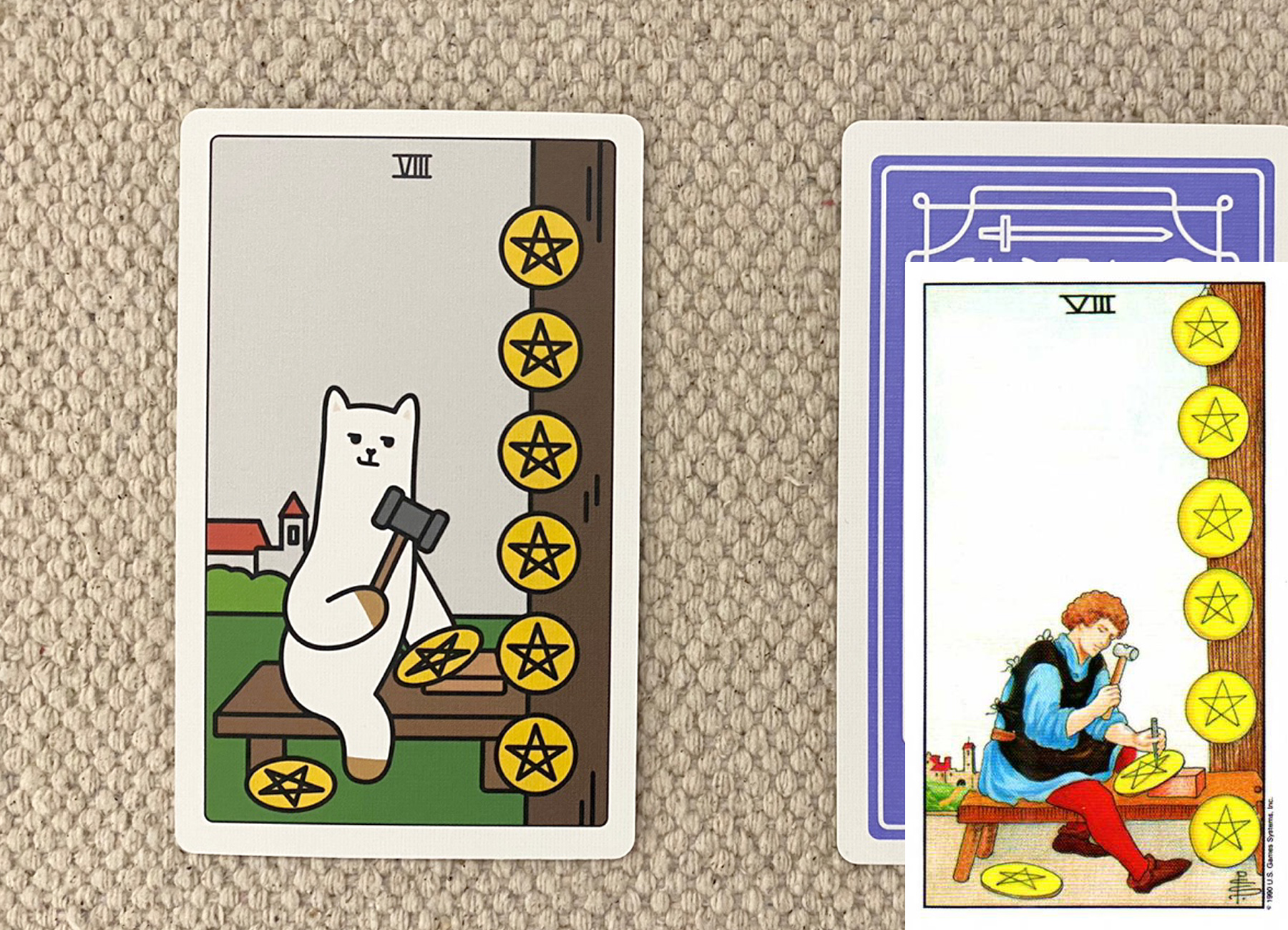 이 8펜타클의 카드는 성실함과 개인적인 노력에 대한 카드입니다. 보통은 일이나 직업, 노동, 돈을 벌기위한 기술을 연마하는 모습을 묘사합니다. 또한 차분하고 자신의 할 일을 묵묵히 해내는 카드이기 때문에 스펙타클하거나 다이나믹한 모습은 없습니다. 주말임에도 불구하고 아직 해야 할 일이 남아 있나요? 아니면 주말이면 또 다른 일들이 벌어지고 있나요? 오늘은 여러분이 하고 있던 일, 해야하는 일을 하는데 묵묵히 전념할 수 있습니다. 그만큼 여러분은 책임감의 무게를 느낄 수도 있습니다. 공부를 해야 한다거나, 주문이 밀려있다거나 손으로 하는 어떤 일을 한다거나 빠듯하게 보내시게 될 것입니다. 이 카드는 초심을 잃지 말고 자신을 돌아보라는 의미도 가지고 있습니다. 혹시 지금 하는 일에서 초심을 잃었다면 마음을 다시 잡아가는 날이 되시길 바랍니다.