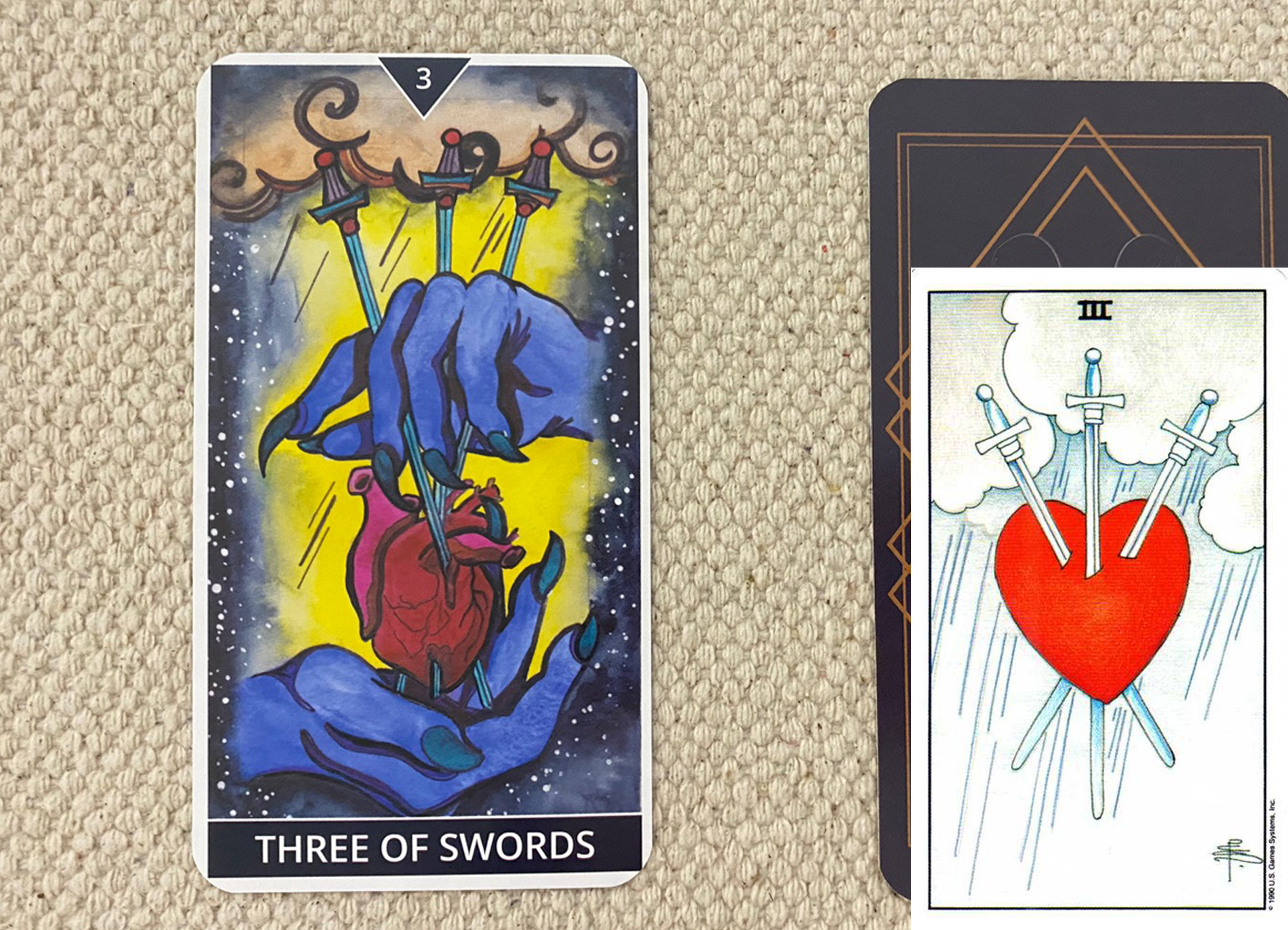 사랑을 나누고자 마음을 열었으나 여러분은 사랑할 수 없는 사람과 사랑에 빠지거나 여러분을 배신할 사람에게 사랑을 나눠줬을지도 모릅니다. 여러분의 친구가 뒤에서 여러분의 얘기를 하는 것을 들을 수도 있습니다. 혹은 당신을 누군가가 속이고 있었다는 것을 알게 될 가능성도 있습니다. 당신이 알던 세계가 갑자기 뒤집어질 수도 있어요. 이 3소드의 카드는 난데없는 고통을 이야기합니다. 여러분이 예상하지 못한 부분에서 오는 고통입니다. 누군가 당신의 심장을 날카로운 칼로 찌르는 것처럼 느낄 수도 있어요. 이런 경우가 아니라면 이 카드는 반대로 여러분이 누군가를 해치려는 당신의 의도가 담겨있을 수 있습니다. 이 카드는 분명 어두운 면이 존재한다는 것을 기억하세요. 그러니 사랑하는 마음을 전하려거든 오늘은 피하세요.