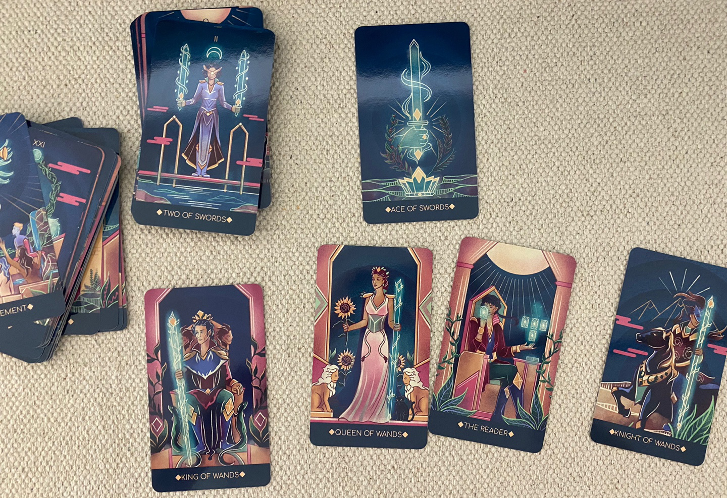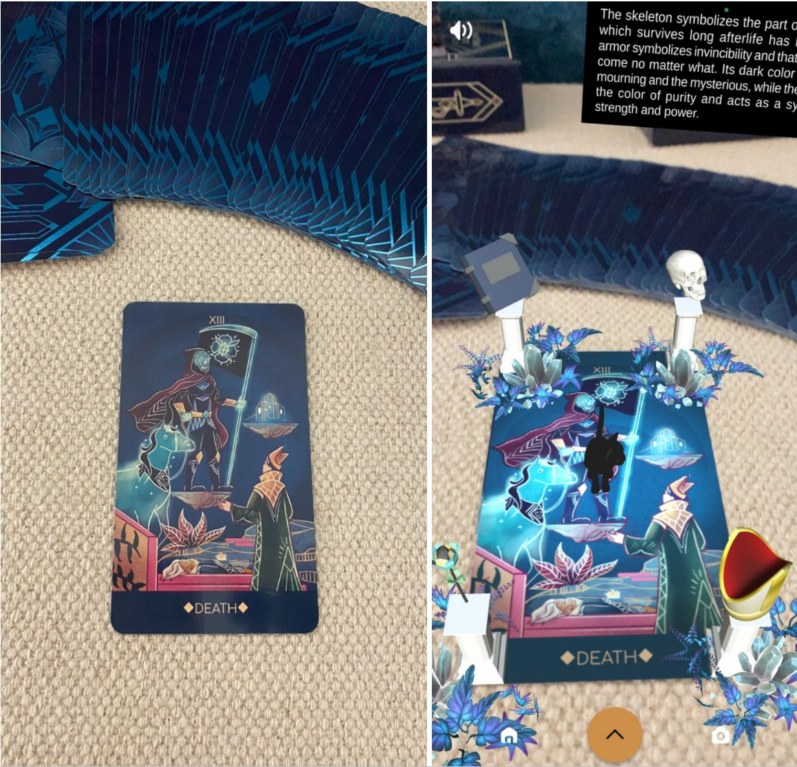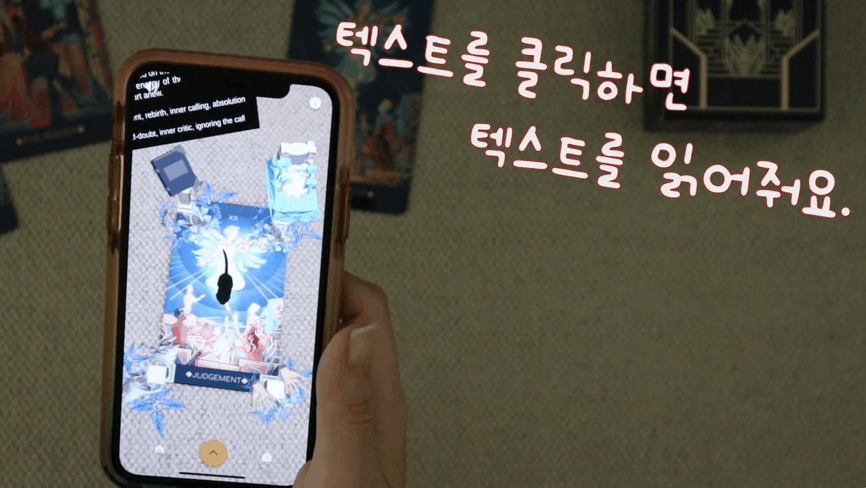 이 카드를 구매한 정말 단 하나의 이유입니다. 회사의 앱 LaMuci Tarot AR을 설치하면 이렇게 증강 현실로 타로 카드를 보실 수 있습니다. 진짜 너무 신기합니다. 앱을 설치하게 되면 스프레드 방식도 선택해서 리딩을 볼 수 있습니다. 물론 전부 영어입니다. ㅠㅠ 하지만 이거 하나로 살 가치 충분합니다. ㅠ