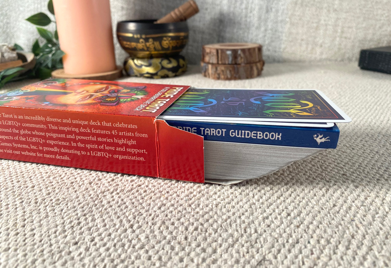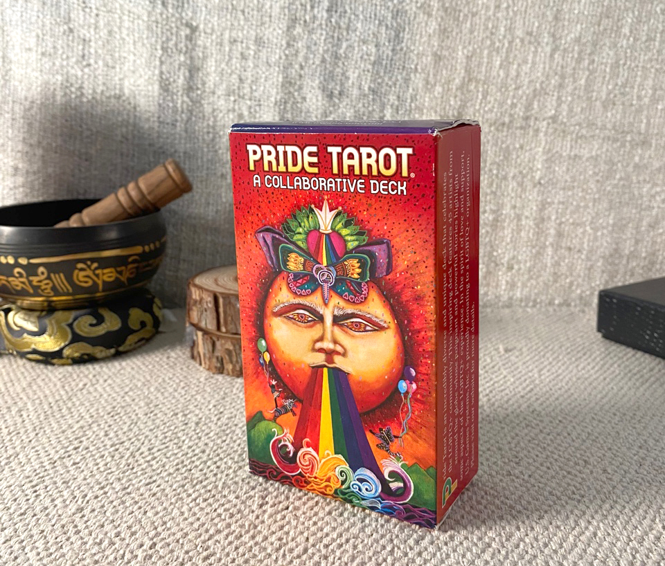 이번 덱은 U.S GAMES에서 나온 '프라이드 타로' 카드입니다. 이 카드는 LGBTQ+ 캠페인의 일환으로 45명의 아티스트들과 콜로보로 제작된 타로 카드입니다. 카드는 하드 박스가 아닌 종이 박스로 되어 있는 카드입니다. 카드 사이즈 역시 보통 저희가 사용하는 중간 사이즈의 카드 크기입니다. 6.9cm * 11.0cm 아무래도 LGBTQ+의 영향을 받아서 카드들의 일러스트를 보면 성소수자를 위한 메시지들이 많이 담겨있는 카드입니다. 박스 앞면에 무지개가 딱~! 있는 거 보이시죠?