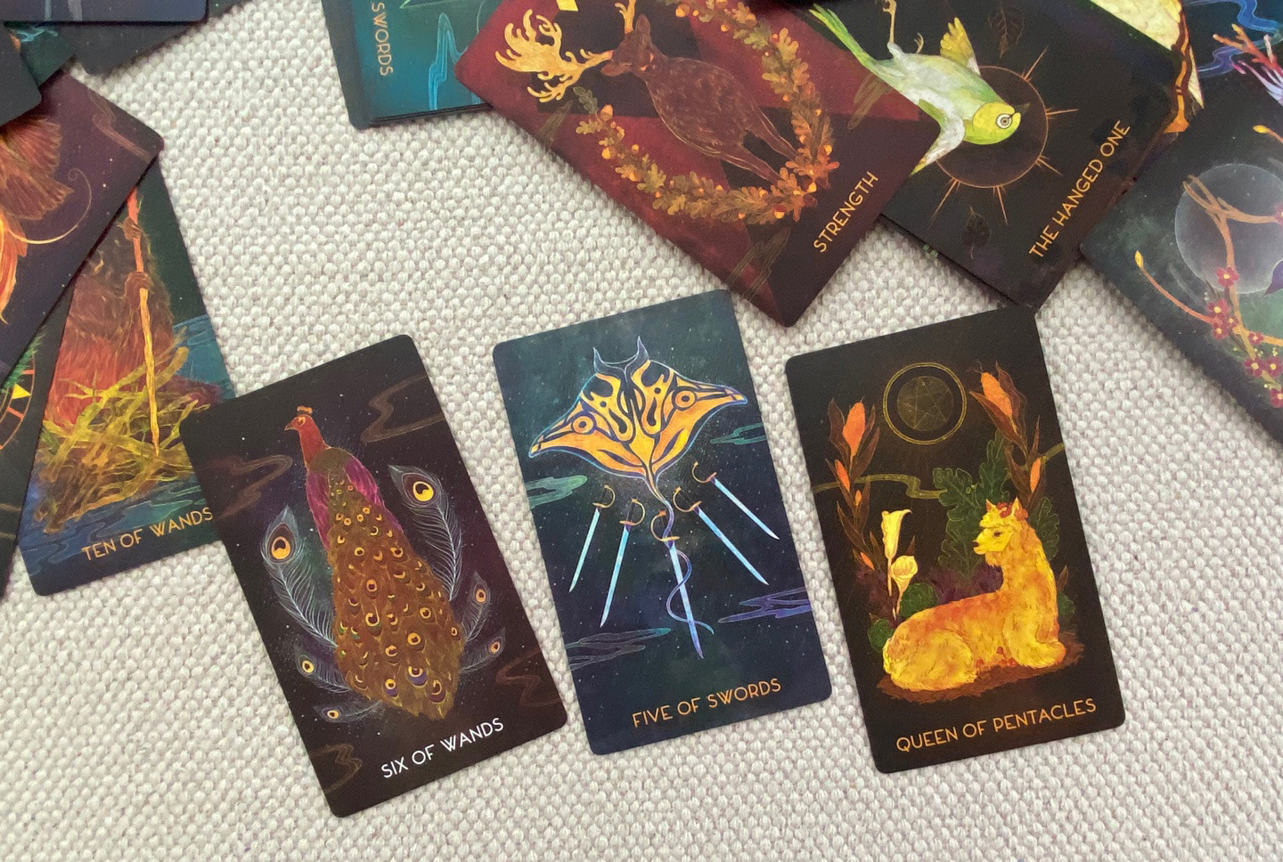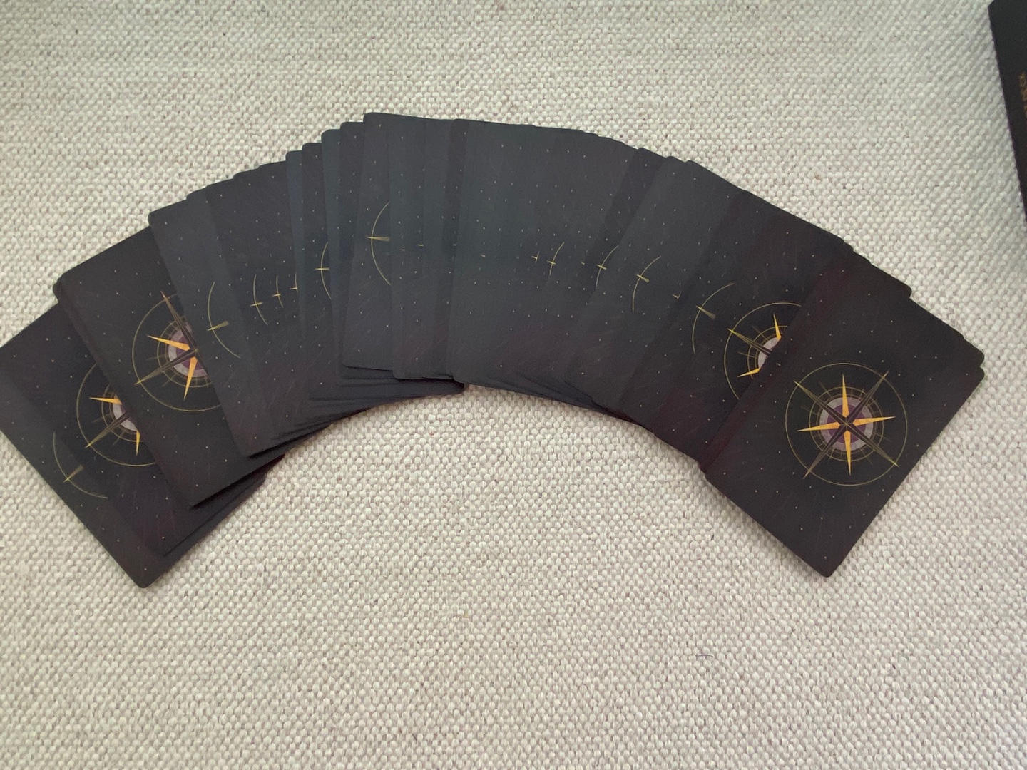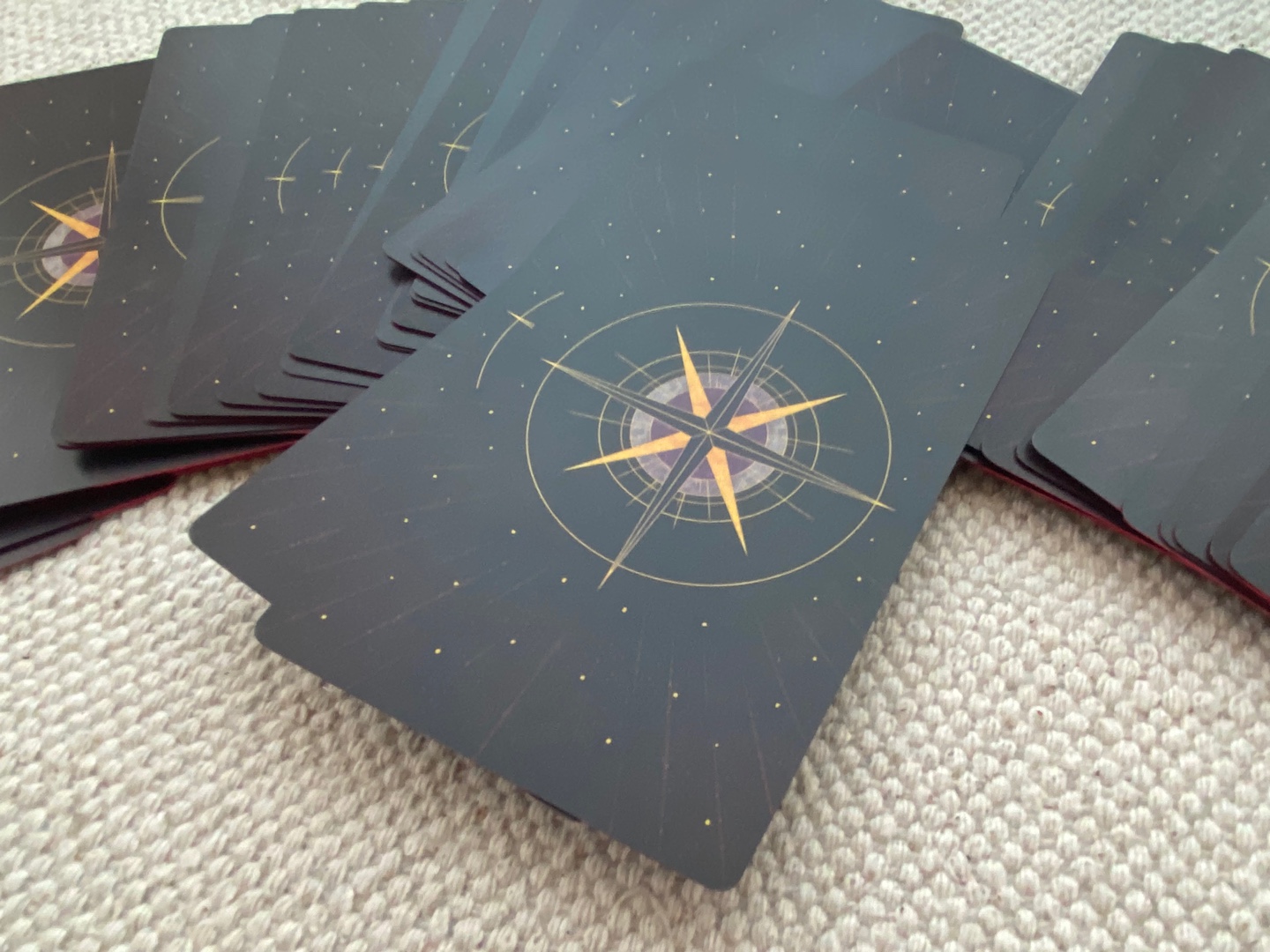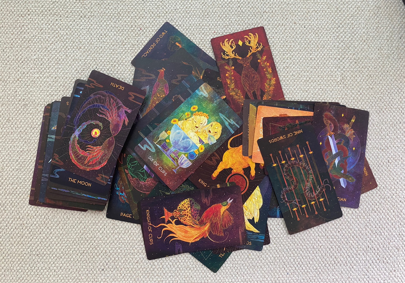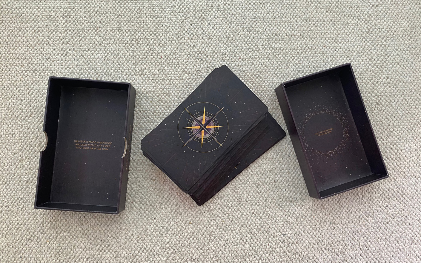 타로 덱은 330gsm의 단단한 종이 재질이고, 제가 좋아하는 무광으로 코딩되었습니다. 카드의 그림들과 어울리며 한층 더 신비로운 분위기를 만들어 주는 것 같아요. 무광코팅이긴 하지만, 셔플 및 스프레드가 잘 되는 되는 카드였어요. 실전에서 사용하시기도 충분한 느낌입니다.