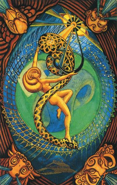 - 해리스는 *사영기하학을 타로 카드 디자인에 접목시켜, 유클리드 기하학을 확장한 개념을 적용했습니다. 이 기법을 통해 해리스는 중심과 주변의 관계를 넘어서서, 시간과 공간의 개념을 재정의하며, 무한한 깊이와 무한한 투영이 동시에 존재할 수 있다는 아이디어를 시각적으로 표현했습니다.