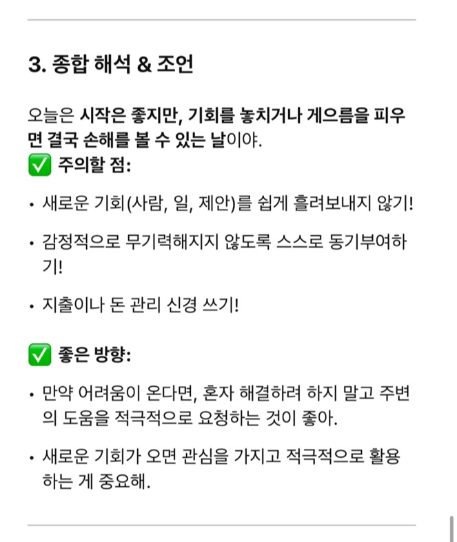 오늘은 시작은 좋지만, 기회를 놓치거나 게으름을 피우면 결국 손해를 볼 수 있는 날이야.