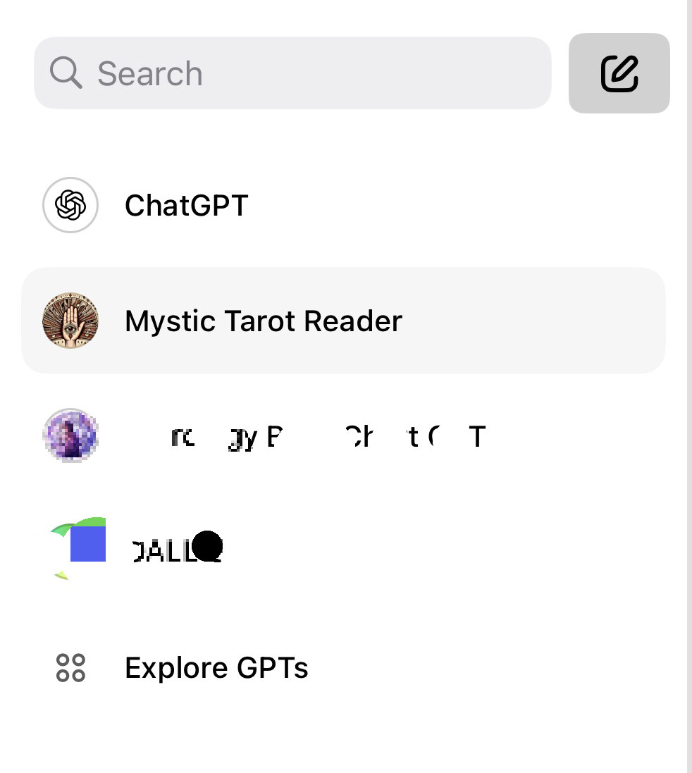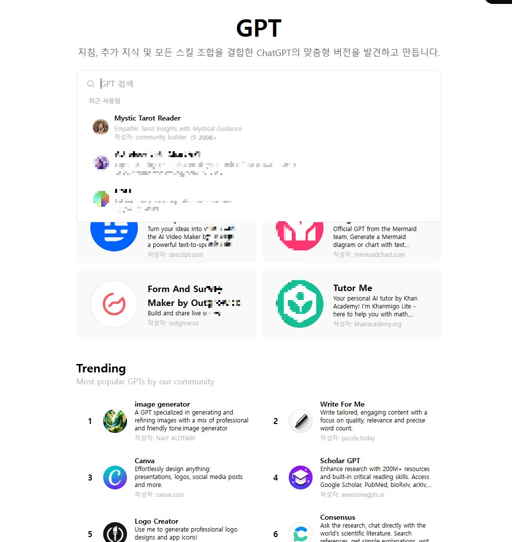 챗 GPT 왼쪽 상단에 보면 Explore GPTs라는 것이 있는데, 여기서 다른 분들이 올려준 타로 마스터 GPT를 이용해서 해석하하는 겁니다. 이미 다른 사용자들이 '타로 마스터 GPTs'를 많이 만들어 놨고, Explore GPTs에서 저는 [tarot]로 검색한 후 제일 사용자가 많은 [Mystic Tarot Reader] GPTs를 사용했습니다.
