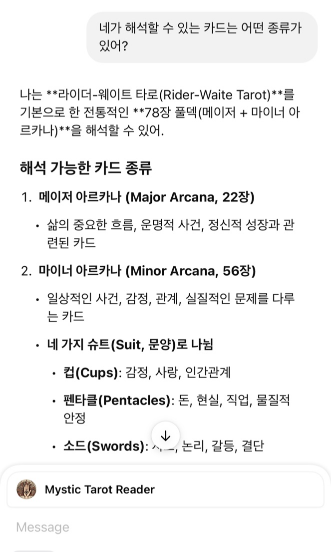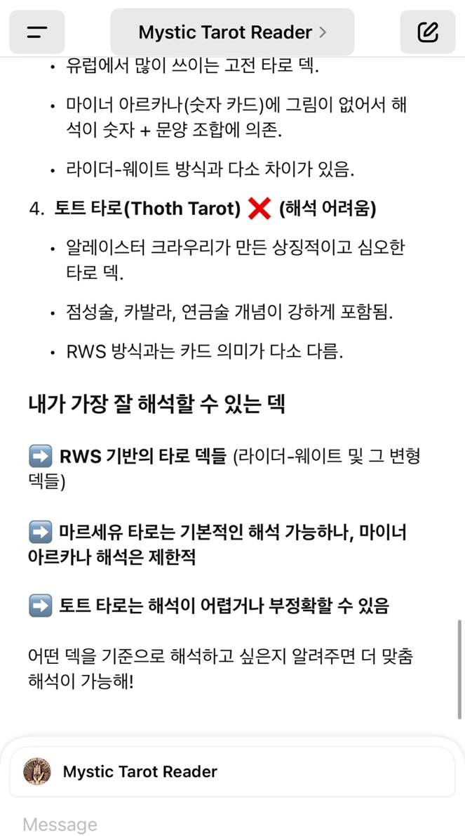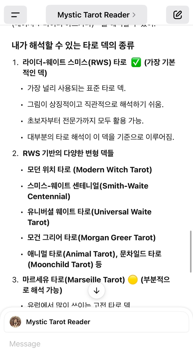 처음 질문으로는 이 GPTs가 해석할 수 있는 덱의 종류를 물어봤습니다. 기본인 라이더 웨이트 외에도 모던 위치, 애니멀 타로, 마르세유, 오쇼젠 등 다양한 타로 덱을 해석 할 수 있다는 답변을 했습니다. 정말 놀랍지 않나요? 정말 다행인 건(?) 아직 토트 타로의 해석을 어려워하고 있네요. (저도 어렵긴 하지만...)