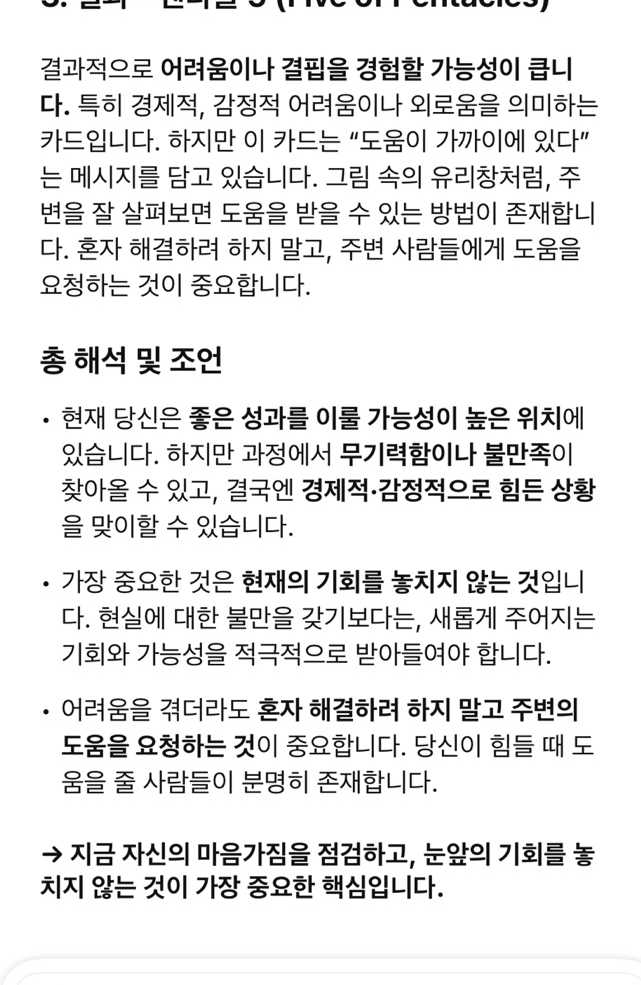 최종적으로 손실, 결핍, 외로움, 어려움을 상징하는 카드가 나왔어. 경제적으로 예상치 못한 지출이 생길 수도 있고, 감정적으로 외로움을 느낄 가능성이 있어. 도움을 받을 수 있는 기회가 있는데도 보지 못하는 경우도 있어. 오늘을 조심스럽게 보내지 않으면, 예상보다 힘든 상황이 올 수도 있어.