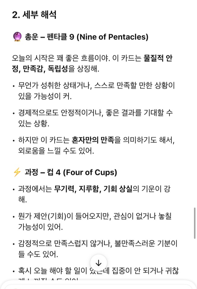 사실 이것보다 복잡하고 다양한 질문들을 했었는데, 블로그 포스팅 용으로 오늘의 운세를 선택했다는 점 참고하시길 바랍니다. 타로 카드 사진 역시 제가 예전에 포스팅에 사용했던 운세 사진입니다. 텍스트로 옮기면 아래와 같습니다.