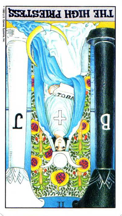 일반적으로 역방향에서도 고위 여사제 카드는 정신을 의미합니다. 흔히 욕정의 영향과 관련 있을 수 있습니다. 이것은 역방향으로 나타날 때, 여러 형태로 나타나게 되면, 고위 여사제가 가져다주는 힘, 매력, 직관의 에너지 라인은 잡기 어려울 수 있습니다. 하지만 그 에너지는 아직 그곳에 있으니, 그것을 찾고, 느끼고, 그것이 길을 인도하도록 해야 합니다.