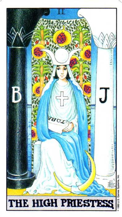 이 카드는 무의식의 수호자라고 할 수 있습니다. 그녀는 각자의 내면세계로부터 우리는 갈라놓는 유일한 것, 가늠할 수 없는 상태의 그늘 앞에 앉아 있습니다. 그녀의 내면에는 모든 것의 비밀이 숨겨져 있으며, 그것은 우리에게 조용히 "그곳에 머물면서 내가 하나님이라는 것을 알라"는 메시지를 전달하고 있습니다. 그녀는 마법사의 남성성과 균형을 이루는 부드러운 여성상입니다. 타로 덱의 여성적인 요소는 황후와 똑같이 나눠져 있습니다. 그녀는 여자들이 자주 나타내는 예측할 수 없는 미스터리를 알고 있습니다. 특히 물질적이고 수준 높은 관습에 집중되는 사회에서는 더욱 그렇습니다. 한편, 여황제 카드는 사회에서 여성의 절대적 역할을 대변하곤 합니다.